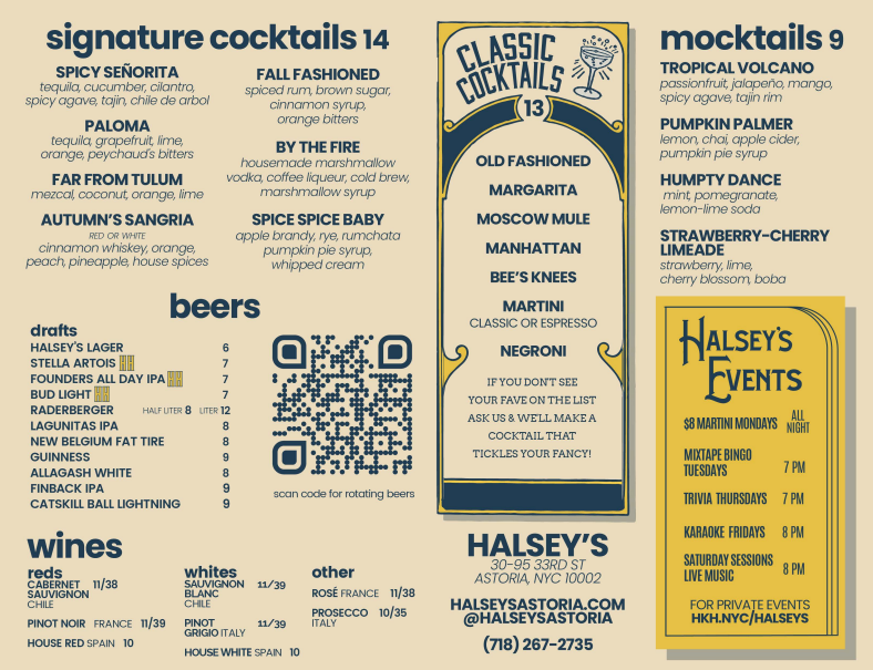 Welcome to Halsey’s, a standout in the New American dining scene located in Astoria, NY. This vibrant eatery excels in offering a delightful blend of innovative dishes and casual charm. Whether you’re stopping by for brunch, lunch, or a late-night bite, the menu promises something for everyone.